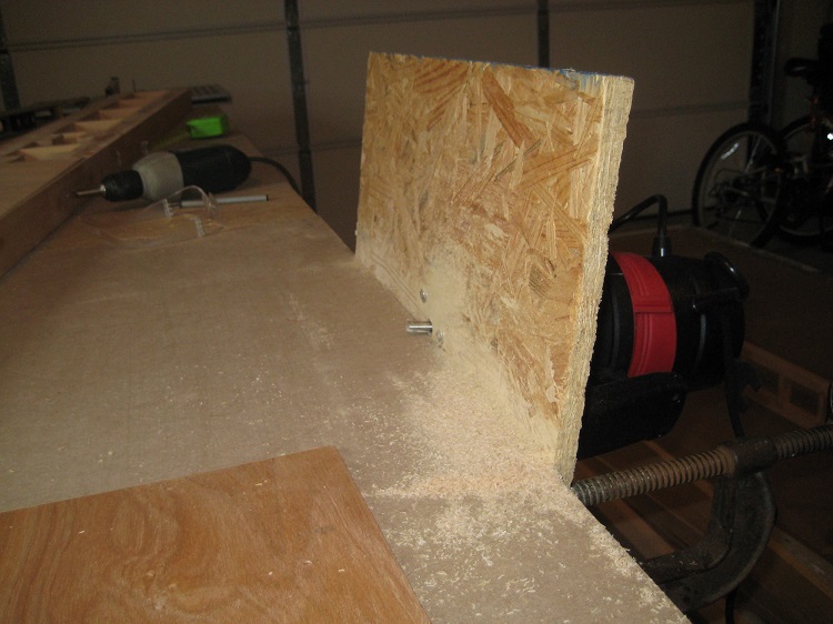 Before covering the side panels (or wing spars later) with 3/32" plywood, you need to scarf the plywood edges so the pieces mate securely and seamlessly. For this operation, I've rigged up the contraption you see here. I bolted my router to a piece of cheap plywood so the blade is sticking through a hole. Then I attached the plywood mount to the worktable with vices. It's tipped back at about a 5 degree angle. Lay the aircraft plywood flat across the table and send it under the blade.